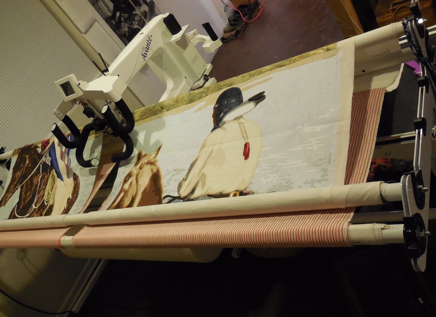 With 2 panels to be stitched, I want to be sure that there is some continuity between them, especially in the background. It should appear to flow from one panel to the next. I’m afraid that if I work one, then the other, I may not match up the right threads or the lines of the composition won’t flow, so I’ve decided to put load both panels on the longarm frame together. This turns out to be a little trickier than I thought it would be. There is a lot of extra attention to be given to how tightly things are wound (the quilt layers, not me personally) All was going well until I got