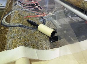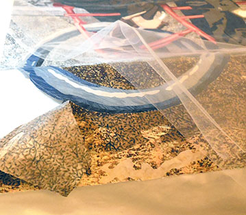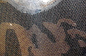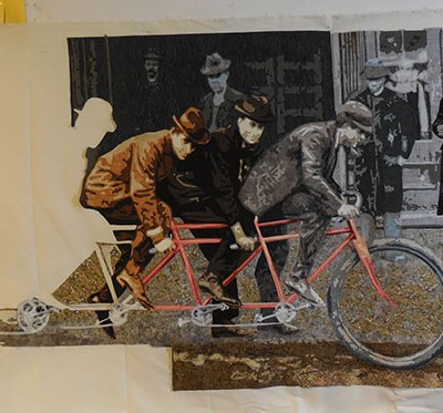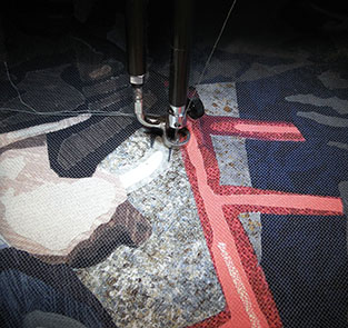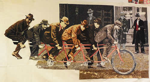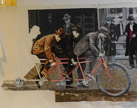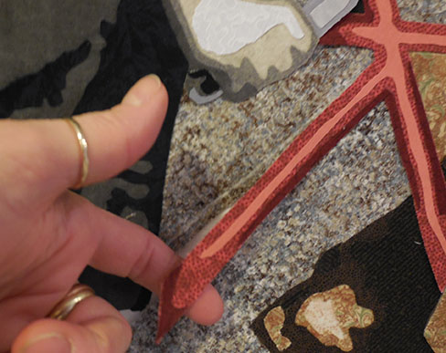 Stitching people is a bit intense. when I have only a short period of time to work and don’t want to dive into the details, I move to the background and begin filling it in. I discover that this too, presents problems. While stitching, I begin to hear a clicking noise. Investigation reveals that I didn’t remove a piece of backing paper before assembling this portion of the work. I need to go in and get it. I declare the need for a “paperectomy” and prepare for surgery. See this delicate operation below. The important thing is to make incisions through the layers at various places. Once done, I can stitch over the area and seal up the cuts that I’ve made. The patient will survive with no permanent scars.