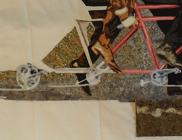 fabric, the man in the background on far right. Since he is first, I’m calling him Adam. Because he is a less significant figure, I’m using him as a warm-up to the big buys on the bike. I started with the vest, using cooler reds than in the bike frame so as to push it into the background,