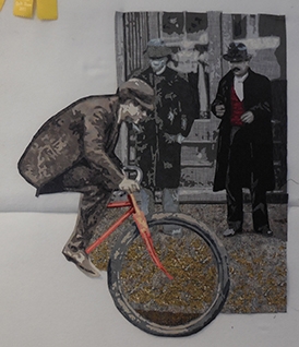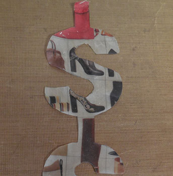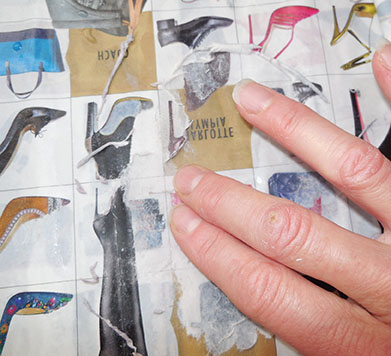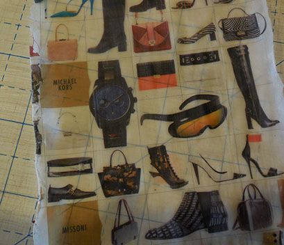 Since “Material Girl” is about materialism and greed I bought some fashion magazines and found pictures of expensive clothes and accessories. My first attempts didn’t work out well. The images that I chose were so large that they were lost when I cut them into smaller shapes. I put a thick layer of gel medium over the images, but the brush strokes left grooves in the surface that tore easily when I rubbed away the paper. Also, I used a high gloss gel and the end results were just too shiny.