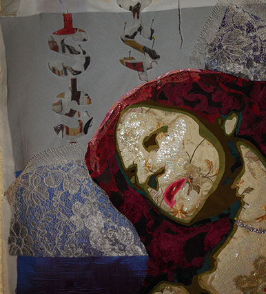 I needed money wallpaper for my latest piece, “Material Girl” and had to find a way to make it myself. It turns out that all of those unrelated workshops where I learn seemingly useless trivia has come in handy. I had a vague memory of being told that images on paper could be captured by painting over them with gel medium. Once dry, the paper can be wetted and washed away, leaving the image on the plastic layer. I asked about this at the art supply store, but no one there had a clue. It didn’t stop me from trying.