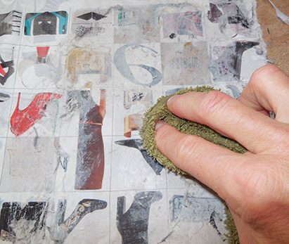Once the gel medium dries, it’s time to plunge it into water. Let it soak for a short period of time, maybe 30 seconds. Then lay it out on a flat surface with the gel side down, smooth it out as best you can and begin rubbing until the paper starts to roll up and off of the surface. I used my fingers at first as it allows you to feel the process and adjust pressure. This was really important in my first attempts as the gel layer was thin and tore easily. However, with a second layer of gel, the surface is more stable and can hold up to more pressure. I found that I could use a wash cloth to rub off the paper. This was much quicker. I do caution that it is through trial and error that one finds the best pressure for working quickly without being destructive.