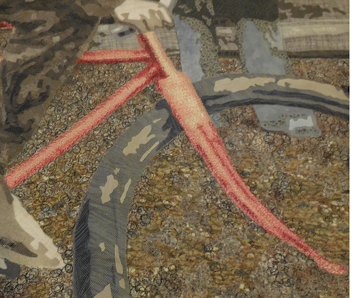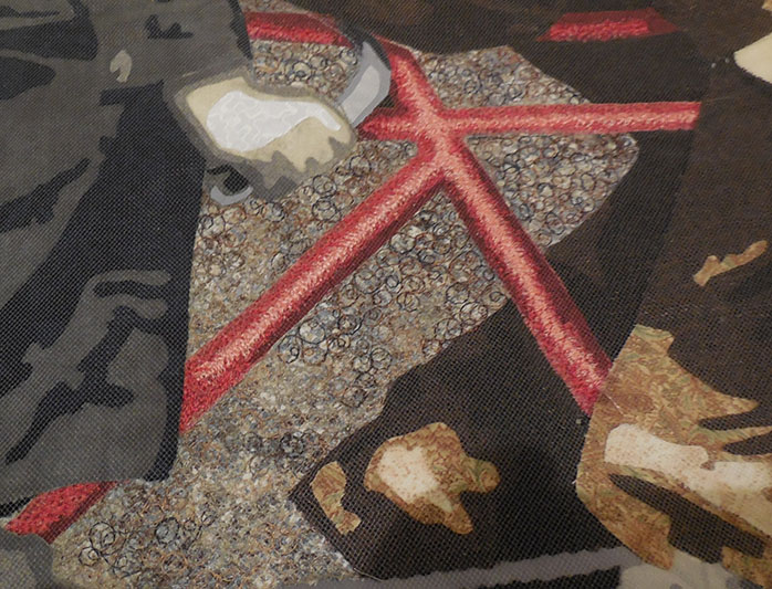 Stitching people is a bit intense. when I have only a short period of time to work and don’t want to dive into the details, I move to the background and begin filling it in. I discover that this too, presents problems. While stitching, I begin to hear a clicking noise. Investigation reveals that I didn’t remove a piece of backing paper before assembling this portion of the work. I need to go in and get it. I declare the need for a “paperectomy” and prepare for surgery. See this delicate operation below. The important thing is to make incisions through the layers at various places. Once done, I can stitch over the area and seal up the cuts that I’ve made. The patient will survive with no permanent scars.