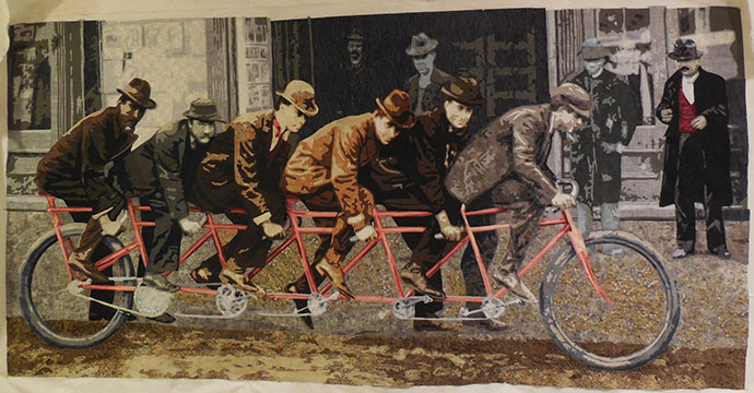 I’ve made huge progress on the Bike Boys this past week. My goal was to complete the fusing phase of the project. While the flywheels in the back need some detailing, and one of the pedals has fallen off and gotten lost, the main work is done. There is enough to look at to make it worthwhile to pin it back up on the design wall and stand back for the full effect.